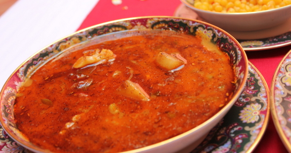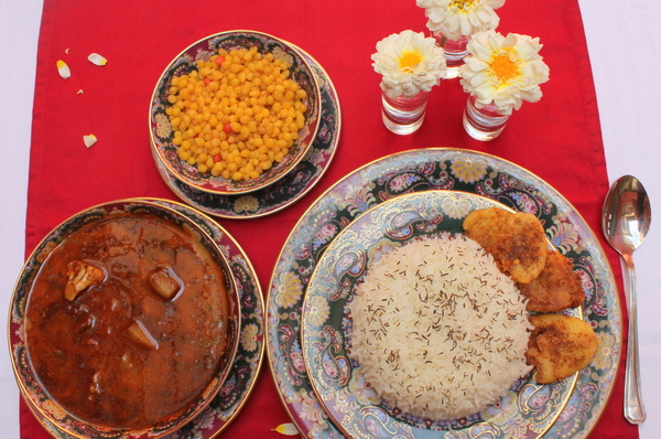 The Sunday lunch in a Sindhi home is sindhi curry served with plain white rice and fried potato crisps.This curry is spicy and sour…with lots of veggies……wonderful flavour and absolutely delicious!!The sweet boodi is served along with this meal.Nothing else is served with this..no accompaniments..no chapatti!!With changing times and lifestyles people might just add a paneer dish and some fried papads.. these are placed for the guests but actually no one enjoys them.
