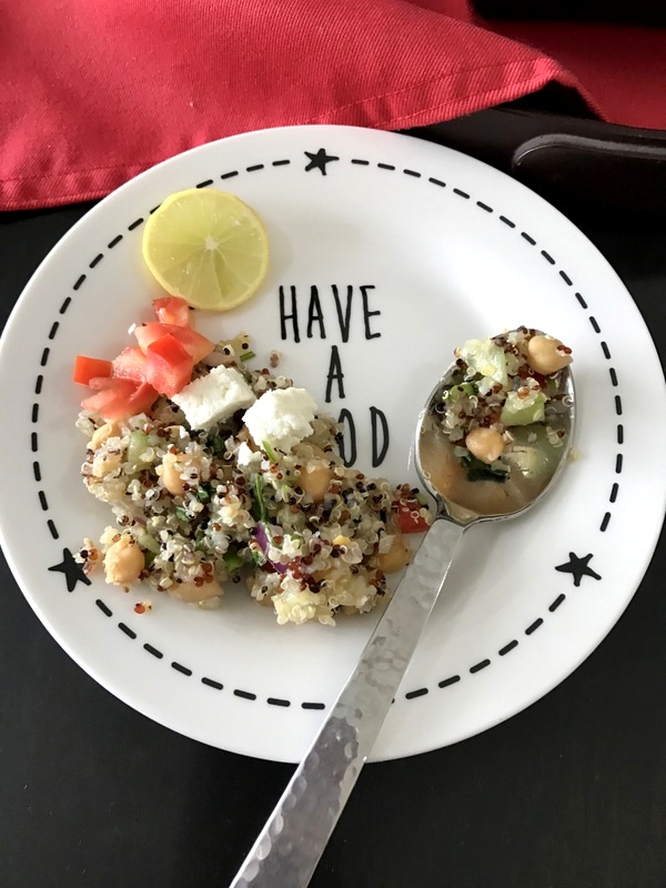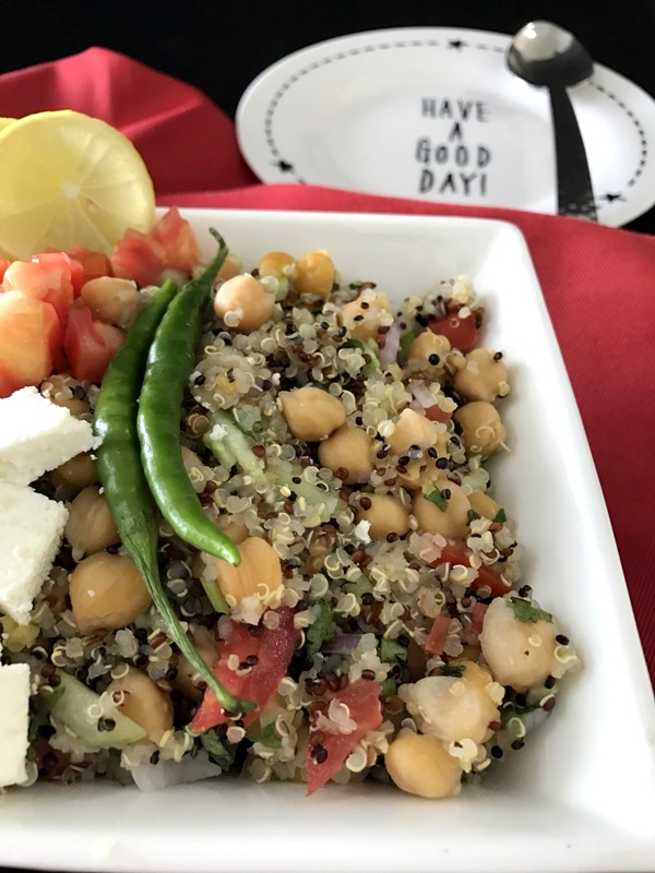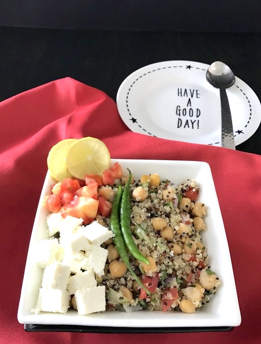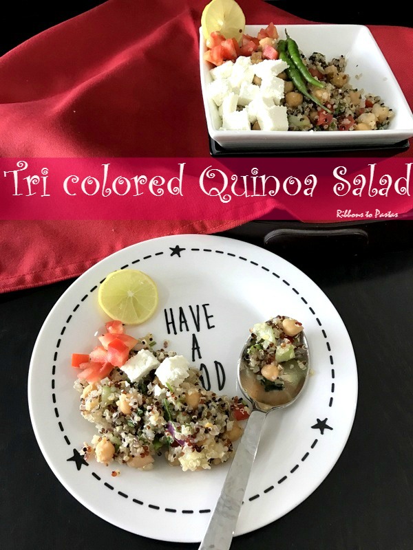 I made a salad straight from Priyas blog, did not make any changes. The salad is full of proteins , with quinoa, chick peas and cottage cheese.The salad turned out delicious. I used cottage cheese instead of feta, feta definitely is a much better option, but my family did not mind cottage cheese too. A salad fan family, my hubby wants it as a complete meal. I do get the regular quinoa here so will make it with that now, but the Tri colors make it look very pretty.