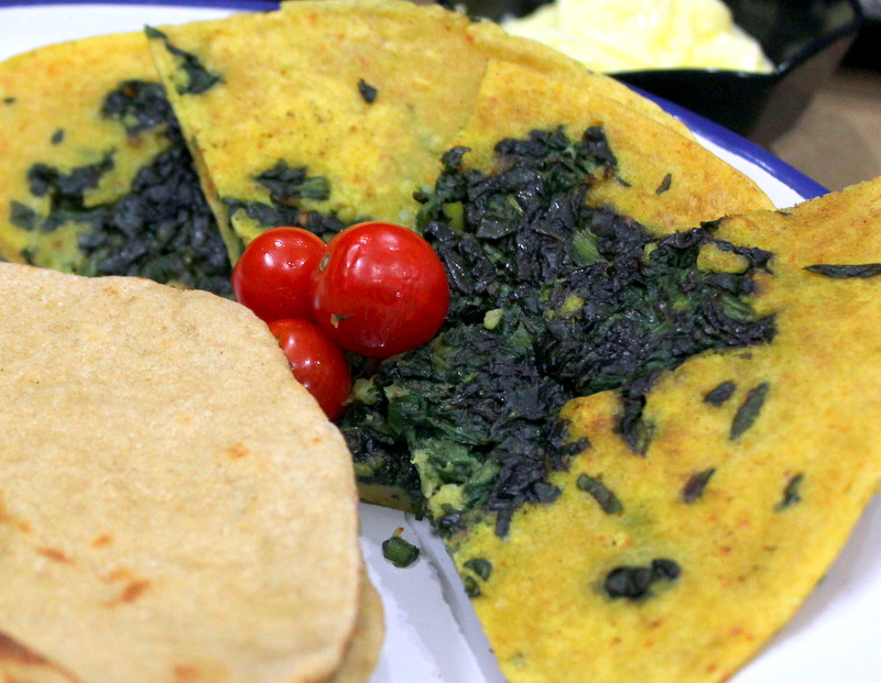 We normally make these vegetarian omelets, but making it with spinach and garlic was new. It tasted really good and everyone appreciated as it had a health factor to it. People who eat eggs can proceed in the same way but instead of the chick pea batter add four beaten eggs.