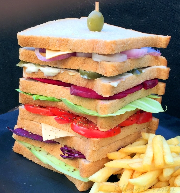 For Day 3 I choose to make a Dagwood Sandwich under the theme American Sandwiches. I was quite taken by this multi layered sandwich. The original sandwich has meat and cheese, but of course mine is a vegetarian version . I checked what the vegetarian version said..it had pickled and marinated veggies, but I decided to make my version. I went according to the street sandwich ingredients that we get here. We get a vegetable sandwich with all possible veggies in it.